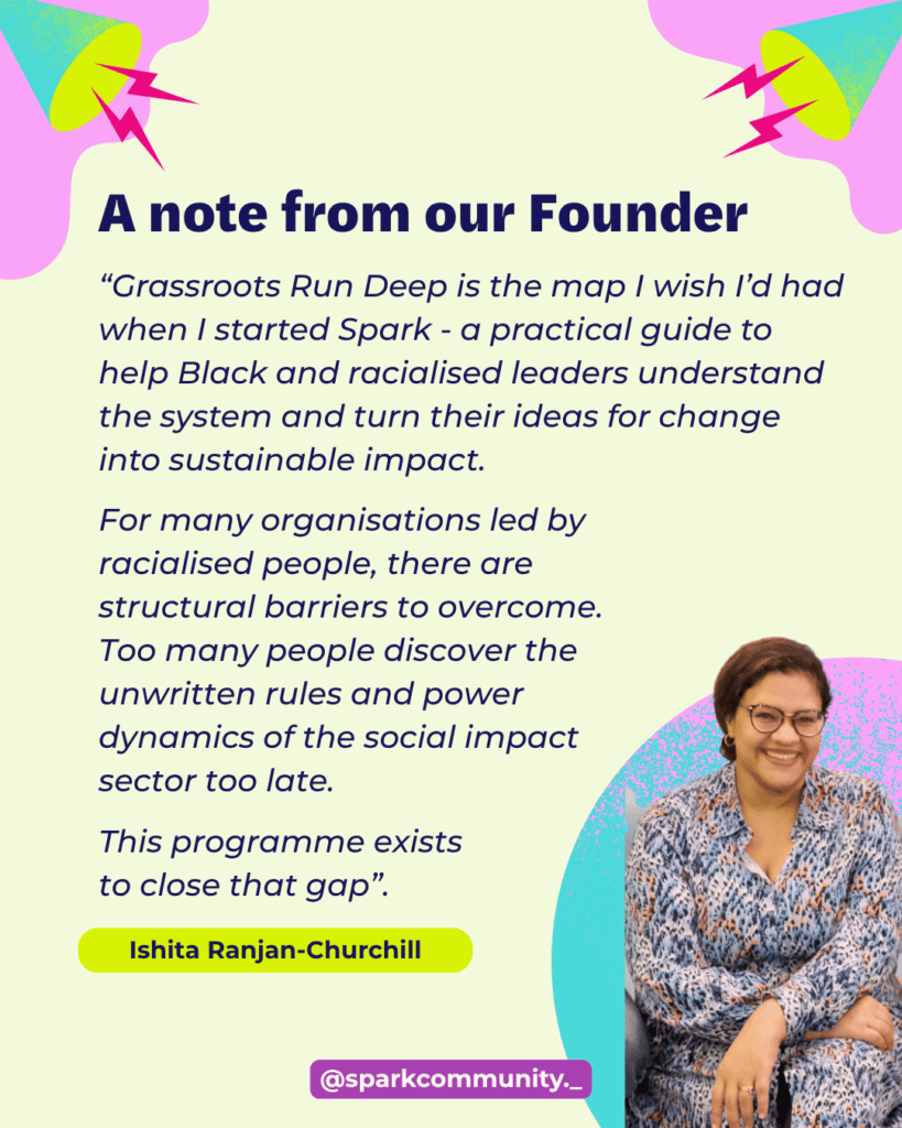 Over the last six years at Spark, we’ve also spoken to community organisations and grassroots leaders almost daily. Through interviews, workshops, advisory sessions and informal conversations, we’ve had hundreds of discussions about what it really takes to build and sustain community-led work in the UK as a marginalised person.
